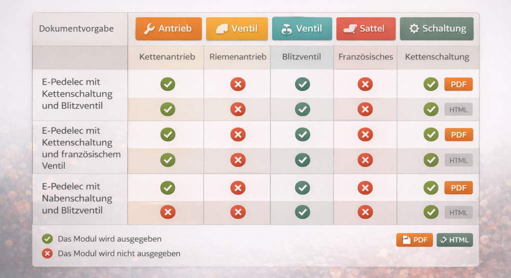 Das Variantenmanagement bildete den Kern des Projekts. Über definierte Merkmale wie Ausstattung oder Zielgruppe wurden die Inhalte in SCHEMA ST4 attribuiert und in einer Variantenmatrix überprüft. Diese Matrix diente als Kontrollinstrument, um sicherzustellen, dass nur die jeweils relevanten Module in einer Publikation erscheinen.